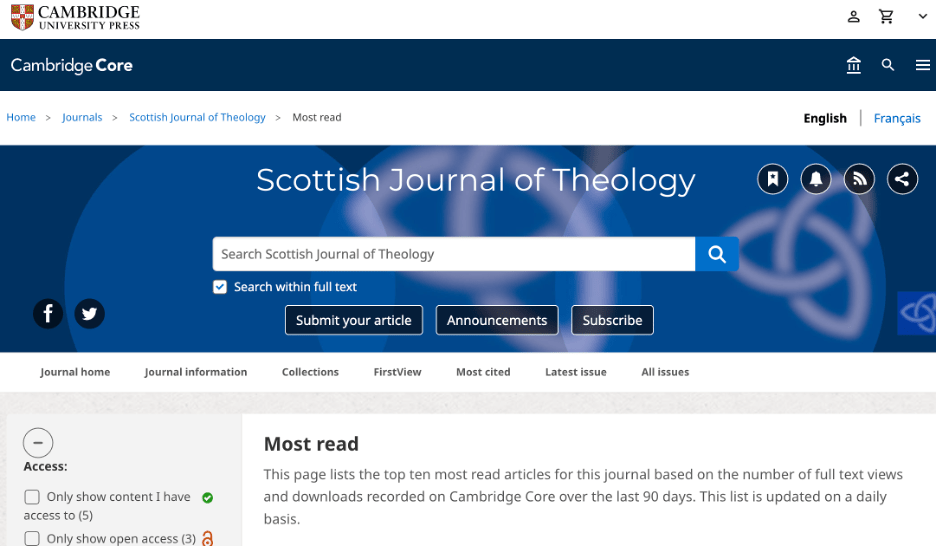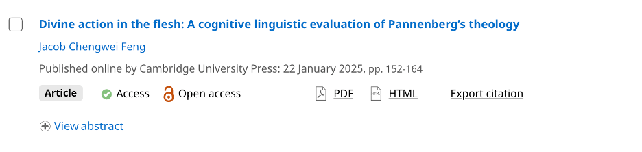 My article “Divine action in the flesh: A cognitive linguistic evaluation of Pannenberg’s theology” is listed as one of “the top ten most read articles for this journal based on the number of full text views and downloads recorded on Cambridge Core over the last 90 days” by the Scottish Journal of Theology.